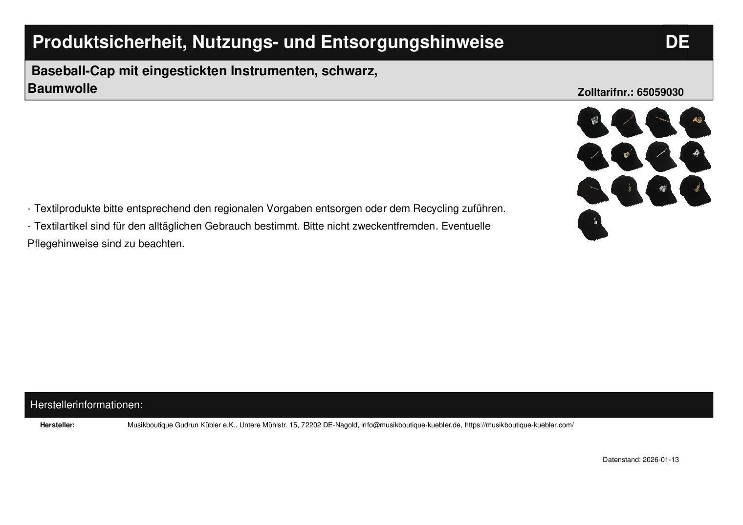 | Titel | Baseball-Cap mit eingestickten Instrumenten, schwarz, Baumwolle |