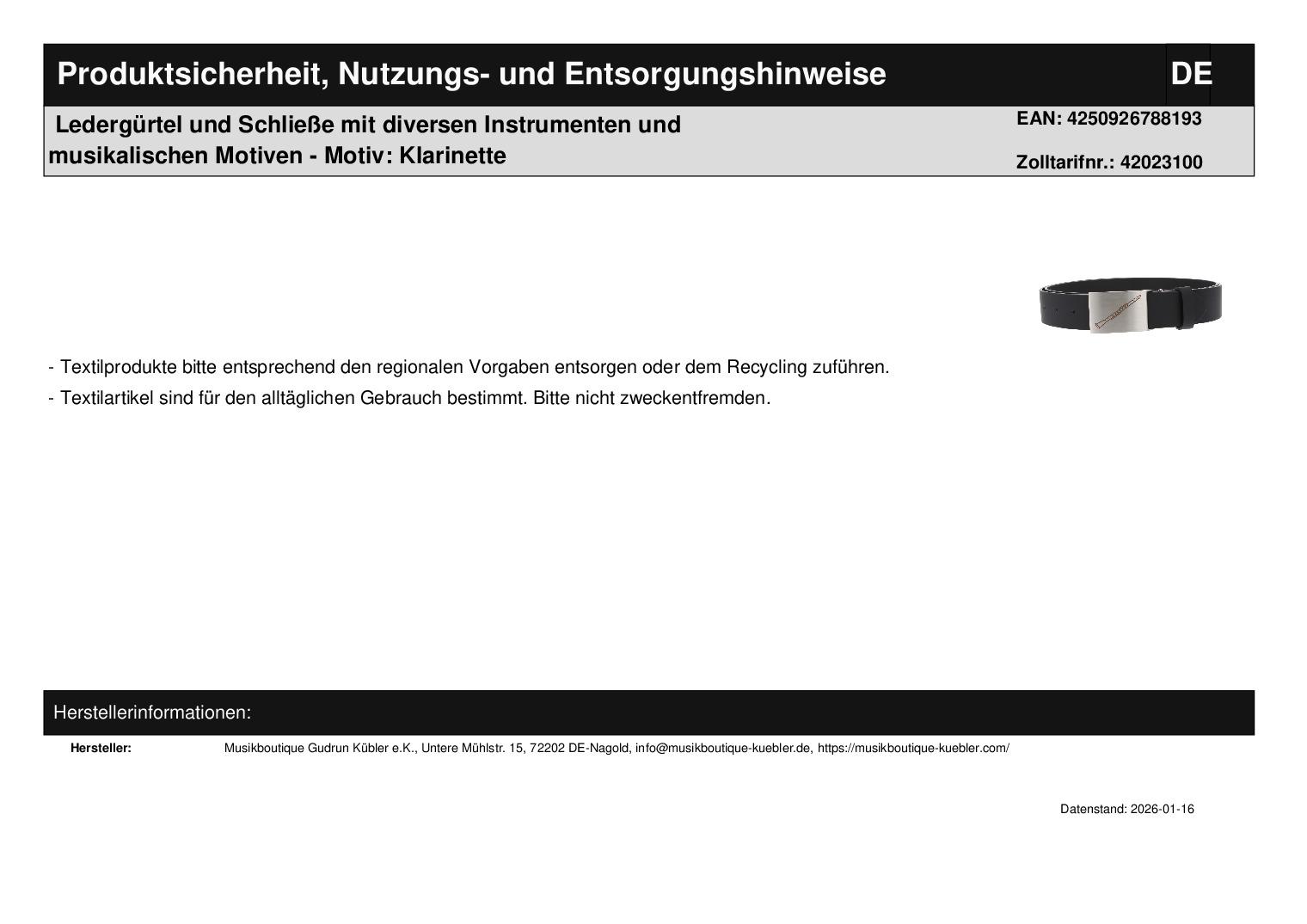 | Titel | Ledergürtel und Schließe mit diversen Instrumenten und graues Baseball-Cap mit eingestickten Instrumenten - Motiv: Klarinette |