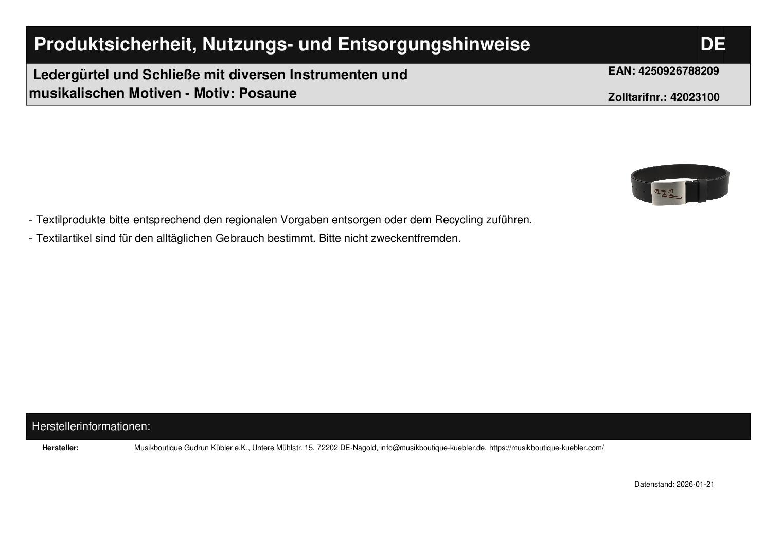 | Titel | Ledergürtel und Schließe mit diversen Instrumenten und graues Baseball-Cap mit eingestickten Instrumenten - Motiv: Posaune |