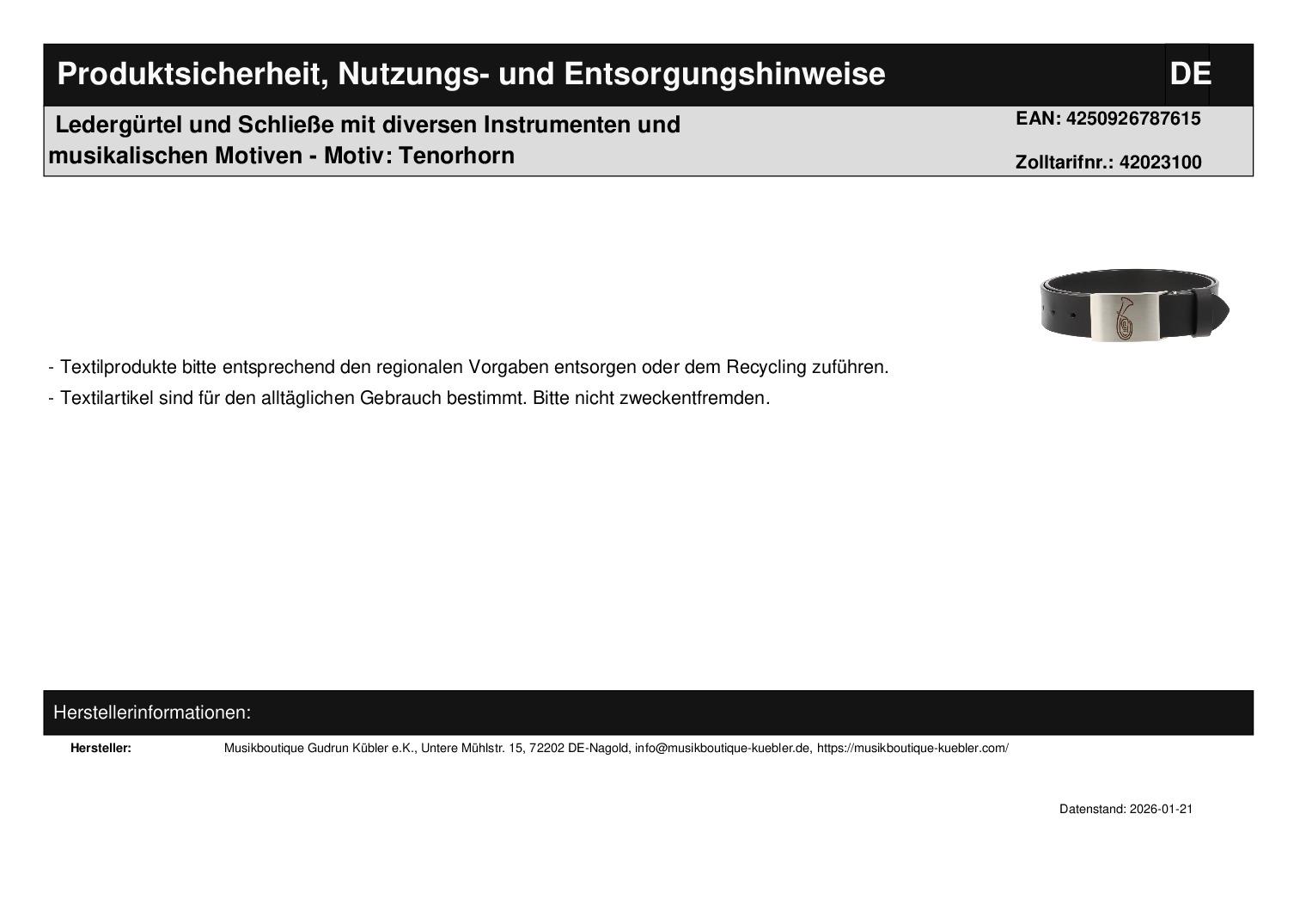 | Titel | Ledergürtel und Schließe mit diversen Instrumenten und graues Baseball-Cap mit eingestickten Instrumenten - Motiv: Tenorhorn |