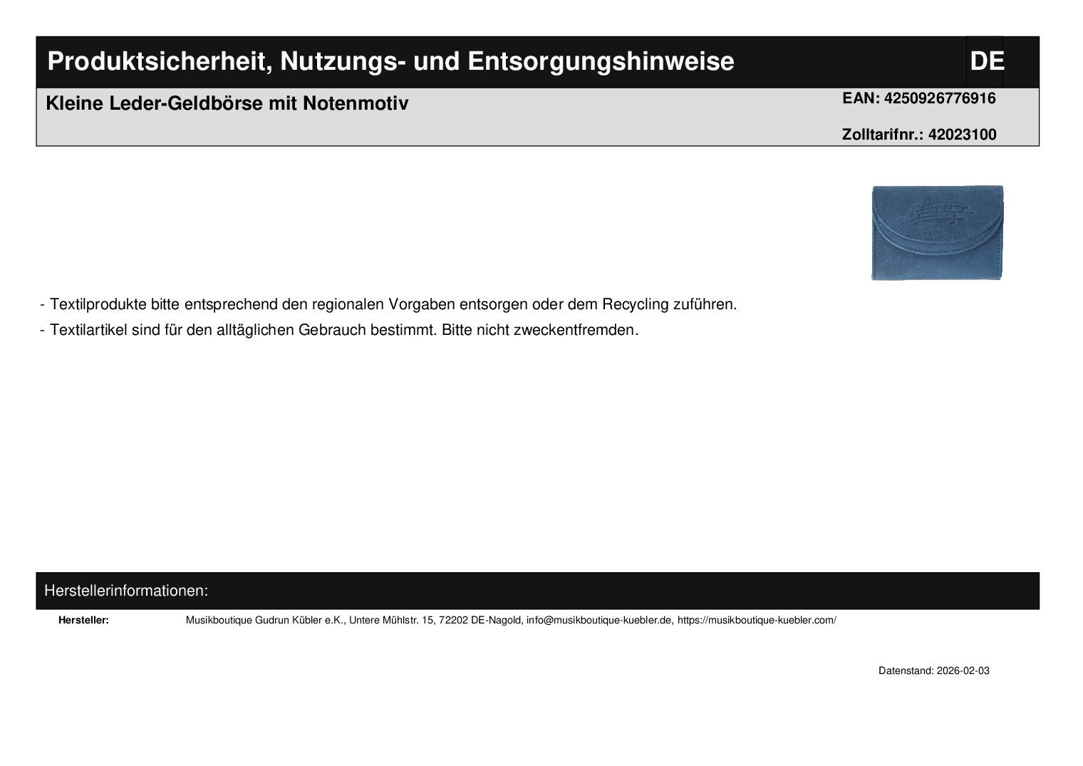 | Titel | Kleine Leder-Geldbörse mit Notenmotiv |