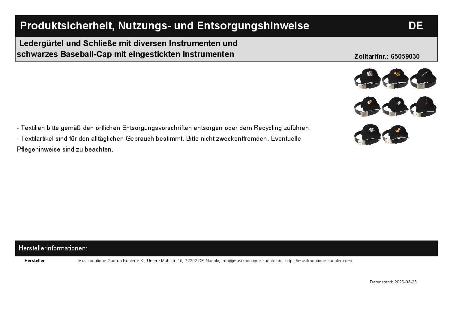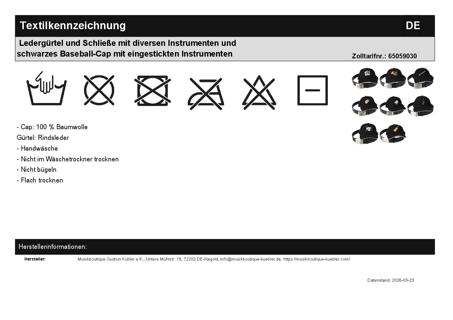 | Titel | Ledergürtel und Schließe mit diversen Instrumenten und schwarzes Baseball-Cap mit eingestickten Instrumenten |