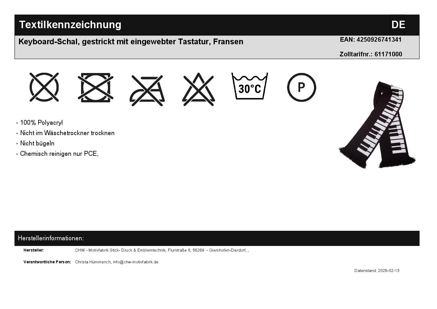 | Textil Materialkennzeichnung (Text) | 100% Polyacryl |