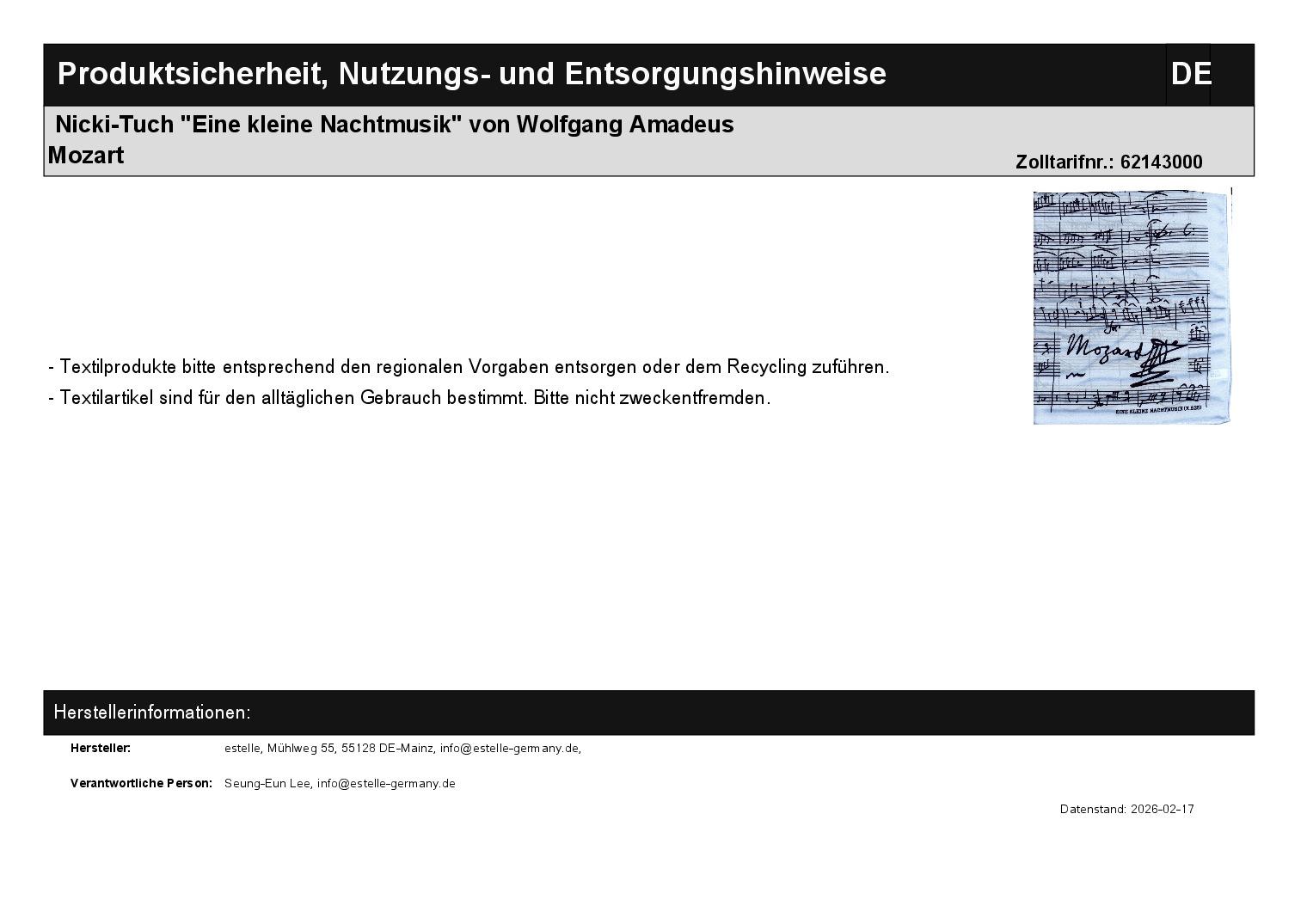 | Titel | Nicki-Tuch "Eine kleine Nachtmusik" von Wolfgang Amadeus Mozart |
