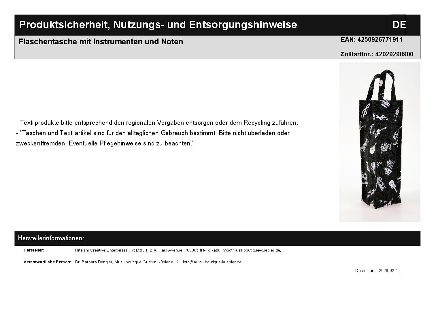 | Titel | Flaschentasche mit Instrumenten und Noten |