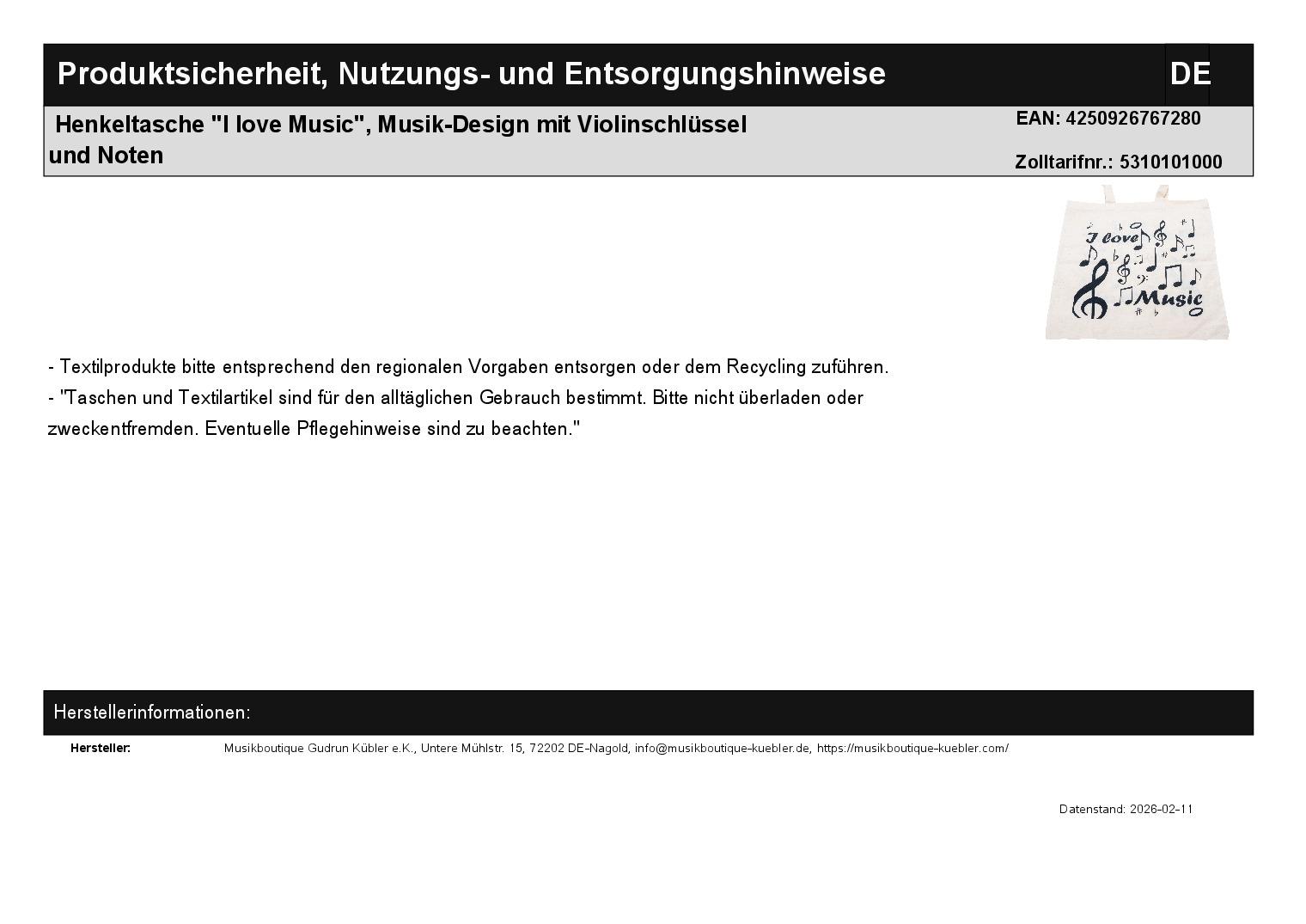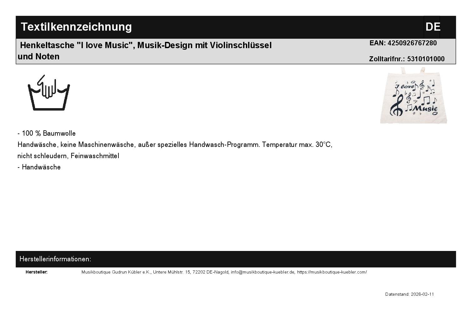 | Titel | Henkeltasche "I love Music", Musik-Design mit Violinschlüssel und Noten |