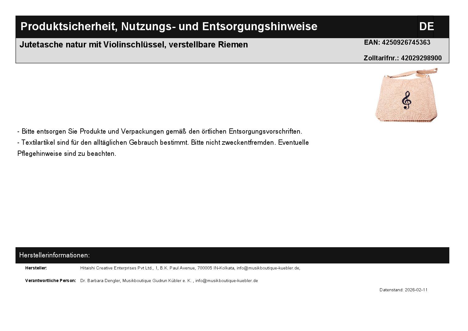 | Titel | Jutetasche natur mit Violinschlüssel, verstellbare Riemen |