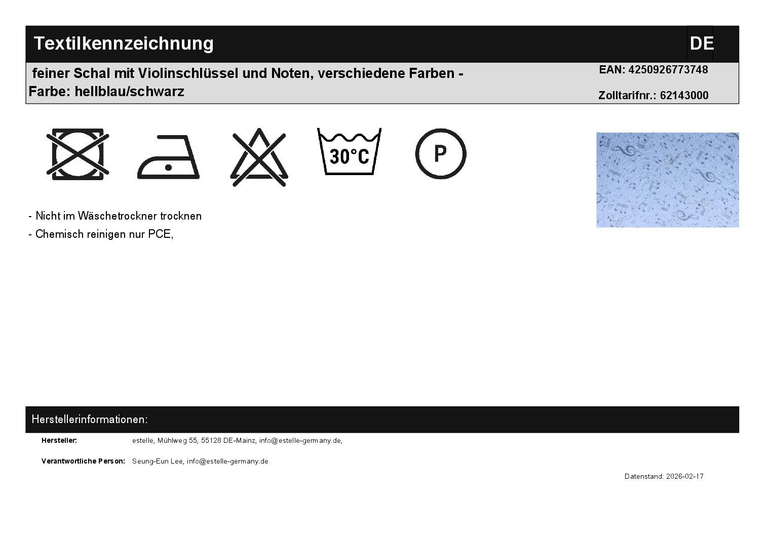 | Titel | feiner Schal mit Violinschlüssel und Noten, verschiedene Farben - Farbe: hellblau/schwarz |
